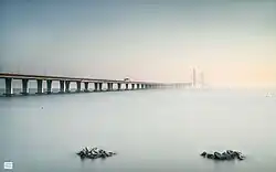 It consists of two long viaducts with a higher cable-stayed section in the middle to allow the passage of ships. The total length is 16.63 kilometres (10.33 mi), of which 6.66 kilometres (4.14 mi) is road and 9.97 kilometres (6.20 mi) bridge. The overall shape of the bridge is not linear but slightly sigmoid (S-shaped).