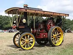 Special Scenic engines were perhaps the ultimate development of the showman's road locomotive. Built almost solely by Burrell's of Thetford (Fowler built just one experimental engine) these were developed for the heavier rides that were emerging. In particular Scenic railways.[7] Basically a 'Special Scenic' engine has a second dynamo located behind the chimney, known as an exciter.[8] This extra dynamo helped to start the heavy new scenic rides.[8] In order to drive the belt for the extra dynamo the flywheel was made wider.[8] The first engine to be built new as a 'Special Scenic' was No. 3827 Victory. Supplied to Charles Thurston of Norwich in 1920, this engine is now preserved in the Thursford Collection in Norfolk.