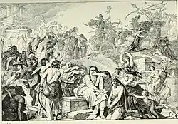 The Jews are led away into prison in Babylon. The city is on fire, and the Ark of the Covenant is taken. Wood engraving after the original painting by Eduard Bendemann (1872)