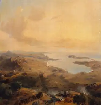 Lángara ordered Don Pedro Cotiella to take three boats into the arsenal to destroy the French fleet. Sir Sidney Smith, who had recently arrived, volunteered to accompany him with his ship Swallow and three British boats. Cotiella was tasked with sinking Toulon's hulks; one was a disarmed former British frigate captured during the American Revolutionary War, Montréal, and the other was the French frigate Iris.[14] These ships contained the gunpowder stores for the entire fleet and due to the danger of explosion were anchored in the outer roads, some distance from the city. He was then instructed to enter the Old Arsenal and destroy the ships there. The dock gates had been barred against attack and manned by 800 former galley slaves freed during the retreat. Their sympathies were with the advancing Republicans so to ensure that they did not interfere, Smith kept his guns trained on them throughout the operation.[15] His boats were spotted by the Republican batteries on the heights and cannonballs and shells landed in the arsenal, although none struck Smith's men. As darkness fell Republican troops reached the shoreline and contributed musketry to the fusillade; Smith replied with grapeshot from his boats' guns.[16]