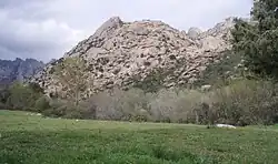 The Pedriza is one of the more exceptional areas of the mountain range. It is located on the south slope of the Cuerda Larga, in the municipal area of Manzanares el Real (part of the province of Madrid) and inside the Parque Regional (Regional Park) de la Cuenca Alta del Manzanares. The Pedriza's landscape is noted for its enormous rock formations and walls of granite displaying unusual and eye-catching configurations. Below the high rocky areas is an underbrush made up of rockroses and savin junipers which become a pine thicket farther way from the rock face. At the heart of the small valleys that make up La Pedriza runs the Manzanares river at the high river basin of its course. In the low part of the area is a recreational area with parking accommodations which allows visitors several routes to cross the territory. The most esteemed and sensational peak of La Pedriza, as well as its largest, is El Yelmo (The Helmet), a gigantic granite rockface towering over the surrounding peaks, rising to 1,700 m in elevation. El Yelmo's south face presents a massive stone wall that is highly prized by advanced mountain climbers. Throughout its history, La Pedriza's complex of caves was used as a hideout by exiles and by those seeking shelter during times of war.