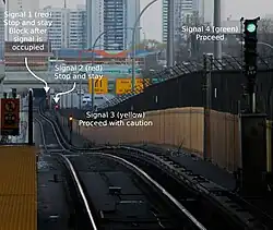 Block signals are the most commonly used signals on the Toronto subway. They are used to keep trains properly spaced, and are controlled automatically by the trains themselves based on their distance relative to other trains, as determined by signal block occupancy. The following block signals are used by the TTC.