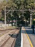 The railway line from Fish Hoek into Simon's Town is single-track, but the station itself has three tracks; one track is served by a side platform next to the station building on Station Road, while the other two are served by an island platform connected by a pedestrian subway.