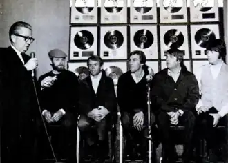 On February 17, 1966, Wilson began recording "Good Vibrations", initially intended for Pet Sounds but later excluded due to his dissatisfaction with the initial recording, experimenting with several arrangements until April.[23] On May 4, during the fourth session for "Good Vibrations", he began recording the track in sections rather than as one continuous performance, intending to splice the segments together later.[24][nb 3] Pet Sounds was released on May 16 and immediately became a landmark album for its sophisticated orchestral arrangements and its role in positioning the Beach Boys among top rock innovators.[2] In the U.S., the album confused their fans and sold worse than previous Beach Boys releases, whereas the British embraced it warmly.[26] This UK success encouraged Wilson to take greater creative risks and convinced Capitol Records to support his next ambitious project.[27]