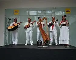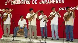 Son Huasteco is performed in the states of Tamaulipas, Veracruz, Hidalgo, San Luis Potosí, Querétaro and Puebla, an area known as La Huasteca.[1] Son huasteco is also called huapango. It is played by a trio of musicians: one playing jarana huasteca (a small five-string rhythm guitar), a quinta huapanguera (an eight-string bass guitar) and a violin. The two guitarists sing coplas or short poetry stanzas, alternating verses between them. Two trademarks of this style are improvised violin ornamentations based on a melody and a high falsetto voice. Its origins are in Veracruz and San Luis Potosí but have spread to the rest of the La Huasteca, especially in the state of Hidalgo. It is very popular in the region for major family celebrations such as weddings.[9]