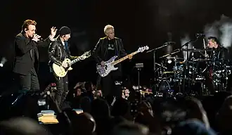 U2 felt that their chemistry was not adequately represented on the album's recordings to that point.[50] Many of the individual parts, particularly Mullen's drums and Clayton's bass parts, had been recorded separately, and in the band's opinion, they lacked the energy that could be captured from a single band take.[30] Having re-rehearsed the songs, in March 2017, U2 entered Electric Lady Studios in New York with their long-time producer Steve Lillywhite to re-record them as a group.[37] Bono called Lillywhite the "best guy for recording us in the studio with the band playing live".[51] The group were satisfied with the results, as they found a synthesis of their "raw band performances" with overdubs from previous recorded versions. The Edge called it "the best of the band chemistry mixed in with the best of the 21st-century production technology."[50]