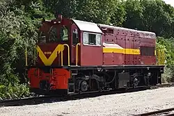 Five locomotives were sold to RRL Grindrod, a joint venture between Solethu Investments, a South African Black Economic Empowerment (BEE) rail logistics company, and Grindrod Limited, a shipping and logistics group, for use at Welkom in the Free State to haul mine hoppers. Four of them were renumbered in the range from RRL 91-01 to 91-04 and their original narrow-gauge bogies were cut in half and widened to 3 ft 6 in (1,067 mm) Cape gauge. The fifth was the accident-damaged no. 91-009 which was completely rebuilt with a 700 hp Caterpillar main engine. It is today (December 2018) the Capitol Park Shunter for Rovos Rail and has been re-numbered 91-011 engine-generator.[8][9][10]