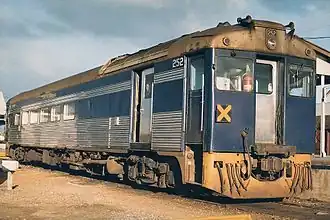 In 1989, shortly before all South Australian country passenger services were withdrawn, the 100 class trailers began to be used as sitting carriages on the Indian Pacific and The Overland.[19][20][21][22] Some were also converted for use as crew carriages on Trans-Australian Railway services.[11][23] Power car 259 was converted to locomotive-hauled car BM259 in 1990 and had its engines removed in 1991.[24] The last were withdrawn in January 1993 and placed in store at Mile End and later Islington Railway Workshops. In May 1995, no. 257 was donated to the National Railway Museum, Port Adelaide.[11][25]