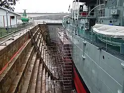 Altars (stepped sides) of South Brisbane Dry Dock, 2007 (HMAS Diamantina to the right)