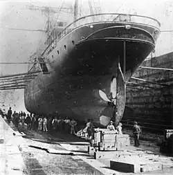 The rocky bottom is lined with 3 feet (0.91 m) of Portland cement overlaid by bricks and covered by Melbourne granite which is crossed by hardwood keel blocks. One Enoggera granite block was used in the coping to the west of the caisson (dock gate), next to a cast-iron plate bearing the contractor's name.[1]