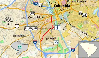 SC 2 is a 3.9-mile (6.3 km), two-lane road just southwest of Columbia, serving as a business route for Cayce. It begins at the US 21/US 176/US 321 concurrency heading northeast. It then takes a turn to the north and runs parallel to the Congaree River to its west. Shortly after passing US 1, the highway ends at US 378 in West Columbia. The highway runs by an elementary school, Brookland-Cayce High School, two shopping centers, and a park.[2]