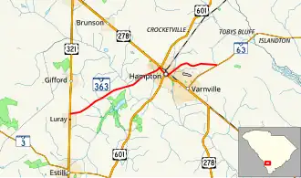 South Carolina Highway 363 (SC 363) is a 13.270-mile-long (21.356 km) state highway in the U.S. state of South Carolina. The highway is designated on an east–west direction, from U.S. Route 321 (US 321) in Luray to SC 63 just outside Varnville.