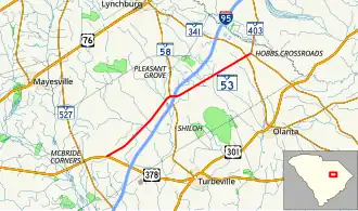 SC 53 begins at an intersection with US 378 (Myrtle Beach Highway) southwest of Shiloh, within Sumter County. It travels to the northeast, through rural areas of the county, and curves to a nearly due east direction. It intersects SC 58 (Pleasant Grove Road), and the two highways begin a concurrency. They have an interchange with Interstate 95 (I-95), where they enter Shiloh. Approximately 500 feet (150 m) later, SC 53 splits off to the south, onto Pudding Swamp Road. SC 53 continues through rural areas of the county to an intersection with SC 341 (Mt. Zion Road). About 2,000 feet (610 m) later is the highway's northern terminus, an intersection with SC 403 (Lynches River Road/Amwell Church Road). This is southwest of the Lynches River.[2]