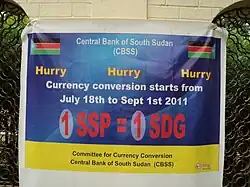 Banner in Juba announcing the conversion from the Sudanese pound (SDG) to the new currency the South Sudanese pound (SSP)