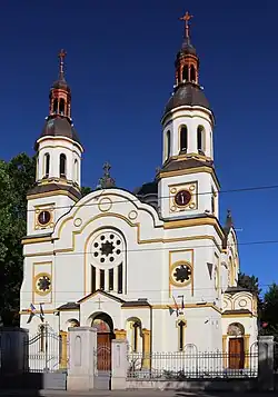 In 1818, the city's Romanians, then under the ecclesiastical tutelage of the Serbian Orthodox Church, were granted the right to build their own church by the royal court in Vienna. Following an offertory launched in Timișoara and in the surrounding villages, funds were raised for the erection of the church and the craftsmen in the district undertook to work for free two days a week to build the church.[1] It was built according to the plans of the archpriest Vasile Georgevici, in the usual architectural style of the Orthodox churches from Banat, being consecrated on 20 July 1826, during the feast of St. Elijah.[1] It was painted by George Petrovici. Although it was established as a separate parish from that of St. George, it was considered a branch of the mixed parish.[2] The Serbian ecclesiastical jurisdiction over the Romanian Orthodox lasted until 1865, when the hierarchical separation of the two Orthodox churches took place.