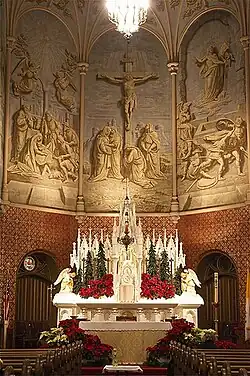 Interior view of St. Francis Xavier Church in Parkersburg, W.V. showing altar and famed murals