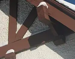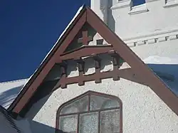 The exterior walls were covered with white stucco. The facades on the southwest end over the baptistery were partitioned by exposed wooden trim (trim and mouldings typical of 14th century Rural Gothic). This theme was also retained over the southwest entrance and within the chancel gable. Exposed timber structure was generalized along with asymmetrical massing and contrasting roof-levels.[11]