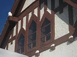 The basement along with the buttresses (two of which were topped with pinnacles) on both sides of the nave and the lower section of the tower were constructed with boulders which were exposed, adding to the general contrasting of textures (stucco, stone, half-timber exterior work)[12]