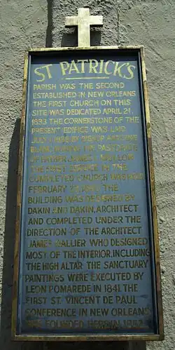 The architect of St. Patrick's Church was James H. Dakin, who designed a number of buildings in Louisiana, including the Old State Capitol in Baton Rouge. Problems related to the city's notoriously high water table drew in another prominent local architect, James Gallier, to oversee the construction.[6][8]