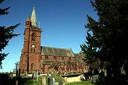 The church is constructed in red sandstone with a grey-green slate roof and a shingled spire.[1] The architectural style is that of the late 13th century.[3] Its plan consists of a west tower, a four-bay nave with a clerestory, north and south aisles, a chancel with a north chapel, and a south vestry, and a south porch. The tower is in three stages with a recessed octagonal spire, and at its southwest is an octagonal stair turret with a small stone spire. Lancet windows are in the first and second stages of the tower, above which are paired bell-openings. At the top is a corbelled open parapet. A rose window is in the north wall of the chapel. Over the south doorway is the damaged dedication stone from the former church.[1] The porch is in striped stone, and has a pointed barrel vault.[3]