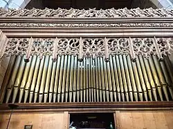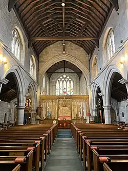 The architectural style is Gothic Revival. The plan of the church consists of a four-bay nave with a clerestory, a chancel with a chapel, and a tower at the southeast corner.[2] Along the sides of the nave are three- and four-light windows.[6] The massive square-plan tower has a slate-covered pyramidal roof, and originally sported four lucarnes. Inside the church the arcades are carried on alternate octagonal and circular piers.[2] The heavily carved rood screen featuring a large number of animals and birds was designed by H. O. Tarbolton, and the font is a copy of a 15th-century font in Suffolk. The pipe organ, originally a house organ belonging to a Mr Robb of Glasgow in the 1850s, was built by J. and A. Mirrlees of Glasgow[7] and substantially rebuilt by that firm in 1914.
