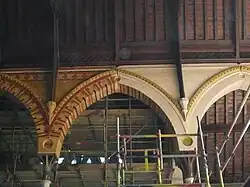 The nave has galleries at a first floor level, on the north, west and south sides. It is unusually wide for its length, and has banded iron columns with sheet copper crafted capitals. The brickwork contains elaborate patterns of buff, red and black bricks, and murals in roundels above the column capitals, and in the reveal of the chancel arch, painted by Edward Frampton. The nave has diagonally-set quarry tiles, and the chancel is Minton tiles.[1]