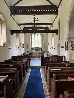 St Nicholas Church is a Grade I listed parish church located in the village of Poling, West Sussex, England. The church exhibits architectural elements from the Saxon period through to the 15th century. Constructed primarily of flint, the church features a nave with a south aisle, chancel, south porch, and a west tower. The interior is characterized by whitewashed walls and plain glass windows, with some fragments of medieval glass. The roof is of braced collar construction, supported by five tie beams adorned with carved wooden bosses, some of which were sourced from the Fitzalan Chapel in Arundel.