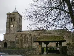 In the churchyard are a number of structures that have been designated as Grade II listed buildings. To the south of the church is a cross erected in 1920 as a memorial to those who died in the First World War. It is in the form of a Celtic cross, and was designed by J. F. Curwen.[7] The lych gate is dated 1894 and has sandstone piers with timber above, and a slate roof with a stone ridge.[8] Immediately to the south of the church is a table tomb to the Docker family, the earliest inscribed date being 1766.[9] To the south of this is another table tomb, this one being to the Crampton family, with an earliest date of 1760.[10] To the southeast of the church is a table tomb to the Dickinson family with an earliest date of 1763, although it was probably not erected until 1770.[11] To the south of the Dickinson tomb is a sandstone sundial dated 1690.[12]