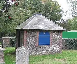 Body snatching was a common crime for a period in the 19th century. Warblington was a popular site for this activity because of its "lonely but well-filled churchyard",[12] isolated in a rural area and well screened by yew trees. In 1829–30 the church authorities employed local builders Benjamin Chase and James Cullis to build huts for grave-watchers at the northwest and southeast corners of the churchyard. Grave-watchers would stand in them and watch out for body snatchers.[12] The single-storey structures are of flint and brick.[12] One was also used as a tool shed[12] after being extended from its original square plan.[13]