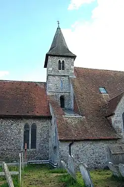 The middle stage of the tower is the oldest surviving fabric of the building, pre-dating the Norman conquest of England. It measures 9 square feet (0.84 m2) externally and has walls of 2.25 feet (0.69 m) thickness. The north and south walls have plain arched openings; another on the west face is now blocked. The stage above this was added in the 13th century and has lancet windows in the north and south faces. The uppermost stage, topped with a shingled spire added during the Victorian era, contains one bell and has paired lancet windows.[1] Internally, the tower is supported on two chamfered and moulded arches spanned by a barrel vault.[1] The east arch is late-13th or early-14th century and now forms the chancel arch.[9]