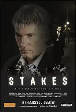 Stakes is a 2015 Australian drama film directed by Richard Owen. It follows the journey of a young aspiring thoroughbred trainer to fill the shoes of her recently deceased father, while battling a corrupt establishment, fraught with unethical competitors and submersed in the criminal element of the horse racing industry. The film stars many local actors from the Riverina region. It is the second feature film to be set in the city of Wagga Wagga.