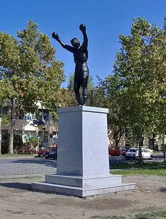 The Statue of Rocky Balboa (Serbo-Croatian: Статуа Рокија Балбое, Statua Rokija Balboe) is a bronze statue in Žitište, Serbia, dedicated to Rocky Balboa, main character from 1976 American sports drama film Rocky, portrayed by Sylvester Stallone. It was made by Croatian artist Boris Staparac, it was erected in 2007.[1] Canadian director Barry Avrich made a documentary film Amerika Idol which depicts the events that preceded the creation of the statue, as well as the ceremony of its installation. The film also features Sylvester Stallone who portrayed the character of Rocky in eight films and A. Thomas Schomberg who made the famous Rocky statue in Philadelphia.[2]