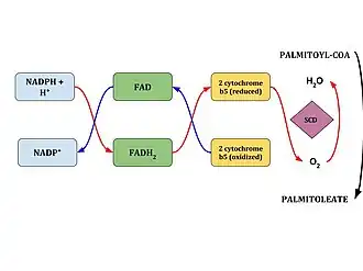 A series of redox reactions, during which two electrons flow from NADH to flavoprotein cytochrome b5, then to the electron acceptor cytochrome b5 as well as molecular oxygen introduces a single double bond within a row of methylene fatty acyl-CoA substrates.[5] The complexed enzyme adds a single double bond between the C9 and C10 of long-chain acyl-CoAs from de-novo synthesis.[1]