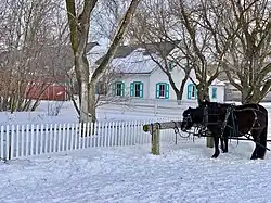 Contrary to the preferences of the Canadian government, the early settlers of Steinbach, like other Mennonite villages, organized the village into a Strassendorf, or street village, with each family occupying a long narrow strip known as a Wirtschaft.[8] In the first year they built temporary shelters known as semlin, before building more permanent housebarns. Most of the settlers were farmers, but in a somewhat urban setting, and lived, to some degree, communally, and shared a common pasture at the end of the village. They started a school in the first year, and in the following year of 1875 built a school and teacherage.[11] Steinbach's Main Street was hacked out of thick poplar bush along the creek, where a bison trail ran, a trail that was still used by Indigenous people during Steinbach's early years.[9]