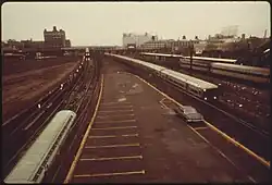 In subsequent years, the tubes of the Steinway Tunnel were difficult to maintain: they were prone to flooding, and the tube walls were much narrower than other tunnels in the subway system, with almost no clearance on each side of the train.[19] After a train got stuck in the tunnel in 1971, a passenger died of a heart attack.[20] A fire broke out on a train in the tunnel in 1973, killing one passenger and trapping over a thousand in the middle of the tunnel, after the collapse of an archway.[21] In 1991, the tubes were flooded to 8 feet (2.4 m) after a water main broke on the Manhattan side.[22] The next year, an electrical fire in the tunnel melted several feet of steel rail, although the tunnel's exhaust fans were working properly.[23] After Hurricane Sandy-related storm surges flooded the tunnel in 2012, the tubes were rebuilt in a $29 million project that took place between 2013 and April 2016.[24][25] To protect the tunnel from future flooding, two retaining walls will be installed on either side of the tunnel portal in Queens, and flex gates would be installed to prevent water from entering the tunnel.[26] The project is estimated to cost $15 million, work was scheduled to begin in May 2021[27] and was still ongoing in 2024.[2]