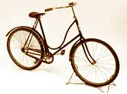 In 1894 Annie "Londonderry" Kopchovsky traveled "around the world" on a Sterling. Starting from Boston and heading west, her first bike was a Columbia but it proved unsuitable. In Chicago, the Sterling company gave her a men's Sterling (weighing 21 pounds, it had no brakes) which made riding in skirts impossible. She then wore bloomers and finally rode in a men's riding suit.[2] Peter Zheutlin's book "Around the World on Two Wheels" [3] records her journey. She claimed to be the first woman to "cycle around the world", duplicating a feat that Thomas Stevens had accomplished 10 years earlier.[4] However, there was much controversy at the time as to whether she really had ridden her bicycle the entire way. In fact, she bicycled across the United States and France, and took steamships and trains the remainder of the way, while obscuring that fact in frequent newspaper accounts. Her ride came during the late 1800s "bicycle craze" and she gained widespread attention for her feat and for wearing bloomers (op cit).