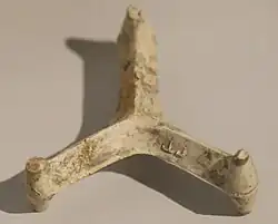 In archaeology, they may be upside-down baked clay tripods, leaving characteristic marks at the bottoms of the pottery/porcelain.[10][11] They expose the bottom of the fired piece to the full heat[12] and prevent the pieces from sticking to each other.