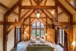 Built using white limestone, a traditional material commonly found in France and not native to the Eastern United States, a slate roof and post-and-beam construction gives this home the appearance of an old medieval structure when in fact it was completed in 2006. The exterior of the Stone Cottage uses a technique called "Slush & Brush" that was employed thousands of years ago, using a wood paddle instead of a trowel and not raking back the joints. The Stone Cottage is only 1,800 square feet (170 m2) and features an open plan Great Room where the kitchen, dining area and living room are located.