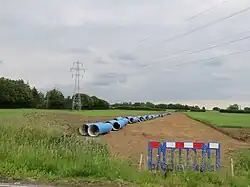 With the capacity of the reservoir increased from 5,700 to 9,000 million imperial gallons (26,000 to 41,000 Ml), two new pipelines were constructed, to improve the transfer of water from the Ouse.[35] The Ely Ouse to Essex Transfer Scheme was licensed to allow 100 million imperial gallons (455 Ml) per day to be transferred, but the pumps at the Kennett pumping station could not deliver this volume, and the maximum permitted discharge into the river at Kirtling Green was 76 million imperial gallons (344 Ml) per day. As part of the upgrade, three additional pumps were installed at Kennett.[36] Around 9.6 miles (15.4 km) of new underground pipeline was constructed from Kirtling Green in Suffolk, along the banks of the Stour to Wixoe, where the water discharges into the river. Most is 4-foot (1.2 m) in diameter, but this reduces to 3.3 feet (1.0 m) for the final 2.1 miles (3.4 km), where the gradient is steeper.[35] It can deliver an additional 32 million imperial gallons (145 Ml) per day into the river system.[36]