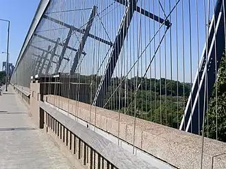 Suicide prevention advocates believe that suicide by bridge is more likely to be impulsive than other means, and that barriers can have a significant effect on reducing the incidence of suicides by bridge.[4] One study showed that installing barriers on the Duke Ellington Bridge in Washington, D.C.—which has a high incidence of suicide[5]—did not cause an increase of suicides at the nearby Taft Bridge.[6] A similar result was seen when barriers were erected on the popular suicide bridge the Clifton Suspension Bridge, in the United Kingdom.[7] Families affected and groups that help the mentally ill have lobbied governments to erect similar barriers. One such barrier is the Luminous Veil on the Prince Edward Viaduct in Toronto, Canada, once considered North America's second deadliest bridge, with over 400 jumps on record.[8]