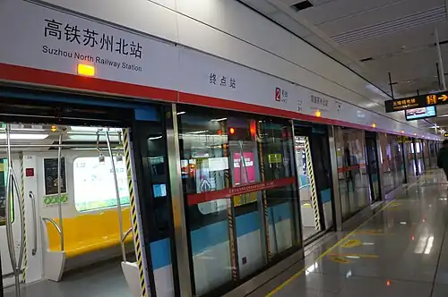 Suzhou North Railway Station (Chinese: 高铁苏州北站) is a station on Line 2 of the Suzhou Metro. The station is located in Xiangcheng District of Suzhou. It started service on December 28, 2013 with the opening of Line 2 and serves Suzhou North Railway Station.[1][2][3]