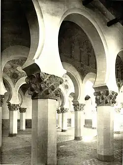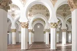 The synagogue is a Mudéjar construction, created by Moorish architects for non-Islamic purposes. But it can also be considered one of the finest example of Almohad architecture because of its construction elements and style. The plain white interior walls as well as the use of brick and of pillars instead of columns are characteristics of Almohad architecture.[17] There are also nuances in its architectural classification, because although it was constructed as a synagogue, its hypostyle room and the lack of a women's gallery make it closer in character to a mosque. Though it does not have a women's gallery today, an early twentieth century architect suggested that it did at one time have one.[18]