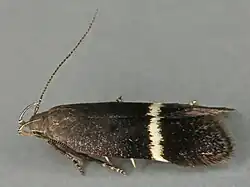 The wingspan is 10–13 mm.[2] The forewings are bronzy-black, somewhat lighter basally; a nearly straight narrow white fascia beyond middle. Hindwings are fuscous, darker posteriorly. Under-surface with white fascia distinct across forewings and forming a costal spot on hindwings. The larva is pale ochreous-yellowish; 3-12 with broad dull red transverse bands, on 3 and 4 somewhat interrupted; head yellow-brown; plate of 2 yellow-brown, posteriorly blackish-marked [3][4][5][6]