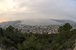 In nine minutes, the 1.5 km (1 mi) long Téléphérique line transports passengers from the bay of Jounieh, above the maritime highway and a pine-forested steep mountain, to an altitude of 650 meters, arriving at the Our Lady of Lebanon shrine in Harissa.[1] The trip offers "spectacularly dramatic views",[2] including panoramic views over the bay.[3] It is considered one of the most popular activities for tourists in Jounieh.[4]