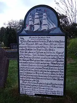 The oldest gravestones were made of sandstone slabs. To put them up in a slanted position, a hole was drilled through the stone so a wooden staff or a whale bone could support the stone.[3] In later times, largers stones became popular that were called 'Bremen stones' according to their origin.[7] The oldest Talking Gravestone dates back to the year 1605.[5] After 1700, the income of the population increased rapidly. because from the 17th to the 19th century, seafarers from Föhr including a number of captains pursued whaling and merchant shipping. In these times, upright tombstones were used more often. Steles were introduced in the 18th century. When they were erected, they were mostly decorated with a coloured ornament on top, the section below would relate the biography of the deceased, and at the bottom would often be a Biblical verse or another image. When old stones were grinded off, the original top decoration often remained intact.[7]