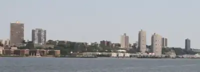 The area lies north of Hoboken and Jersey City, across the river from Midtown Manhattan and the Upper West Side in New York City, and east of the New Jersey Meadowlands. Its high elevation of about 260 ft (79 m)[1] affords North Hudson expansive views of the Manhattan skyline to the east and of the Meadowlands, as well as the Watchung Mountains beyond, to the west. Many of the tall buildings are part of a string of residential high-rises that continues north along the Boulevard East–Palisade Avenue–River Road corridors into the eastern Bergen County towns of Cliffside Park, Edgewater and Fort Lee.[2][3][4][5][6][7][8] Many of the buildings went up during a boom in development in the late 1960s and early 1970s.[9][10][11][12] In Weehawken, building heights are restricted if they would disturb the view of the Hudson River and New York skyline.[13][14][15][16] There is proposed state legislation to restrict building heights that would rise above the cliffs or Palisade Avenue along the entire corridor from Jersey City to Fort Lee.[17][18][19][20]