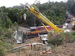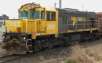 On 2 September 1998, DQs 2001 and 2002 arrived in Bell Bay.[3][4] After arrival, the locomotives were towed to Tasrails East Tamar Workshops for adjustments and testing, before entering service later that month.[5] A second batch of three locomotives arrived on 16 December 1998, with the third batch arriving on 3 March 1999. The last batched arrived on 5 October 1999. The locomotives have had a high number of main generator failures, since their arrivals. Reductions in rated haulage capacity in recent years have reduced the number of in service failures and train operating problems.[6] The locomotives have also had vibration issues in Tasmania, and well as in New Zealand since being rebuilt.[5] The locomotives were later sold to AN Tasrail.