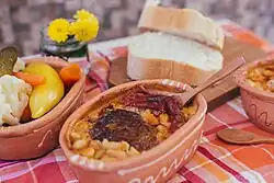 Tavče gravče (Macedonian: Тавче-гравче) is a traditional Macedonian dish.[1] It is prepared with fresh beans and can be found in many restaurants in North Macedonia. It is also commonly eaten by the Macedonian diaspora. This meal is baked and served in a traditional unglazed earthenware pot. The name of the dish may be translated as "beans on a tava". Tavče gravče is considered the national dish of North Macedonia.[2] "Tavče gravče Tetovo style" is a popular regional variation.