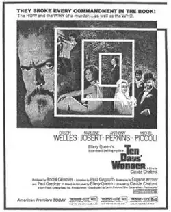 Ten Days' Wonder (French: La Décade prodigieuse) is a 1971 murder-mystery film directed by Claude Chabrol and starring Michel Piccoli, Anthony Perkins, Marlène Jobert and Orson Welles. It is based on the 1948 novel Ten Days' Wonder by Ellery Queen, with the detective renamed Paul Régis. It is the fourth film that Welles and Perkins appear in together after The Trial in 1962.[2]