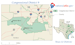 Texas's 9th congressional district of the United States House of Representatives includes the southwestern portion of the Greater Houston area in Texas. The current Representative for the district, since 2005, is Democrat Al Green.